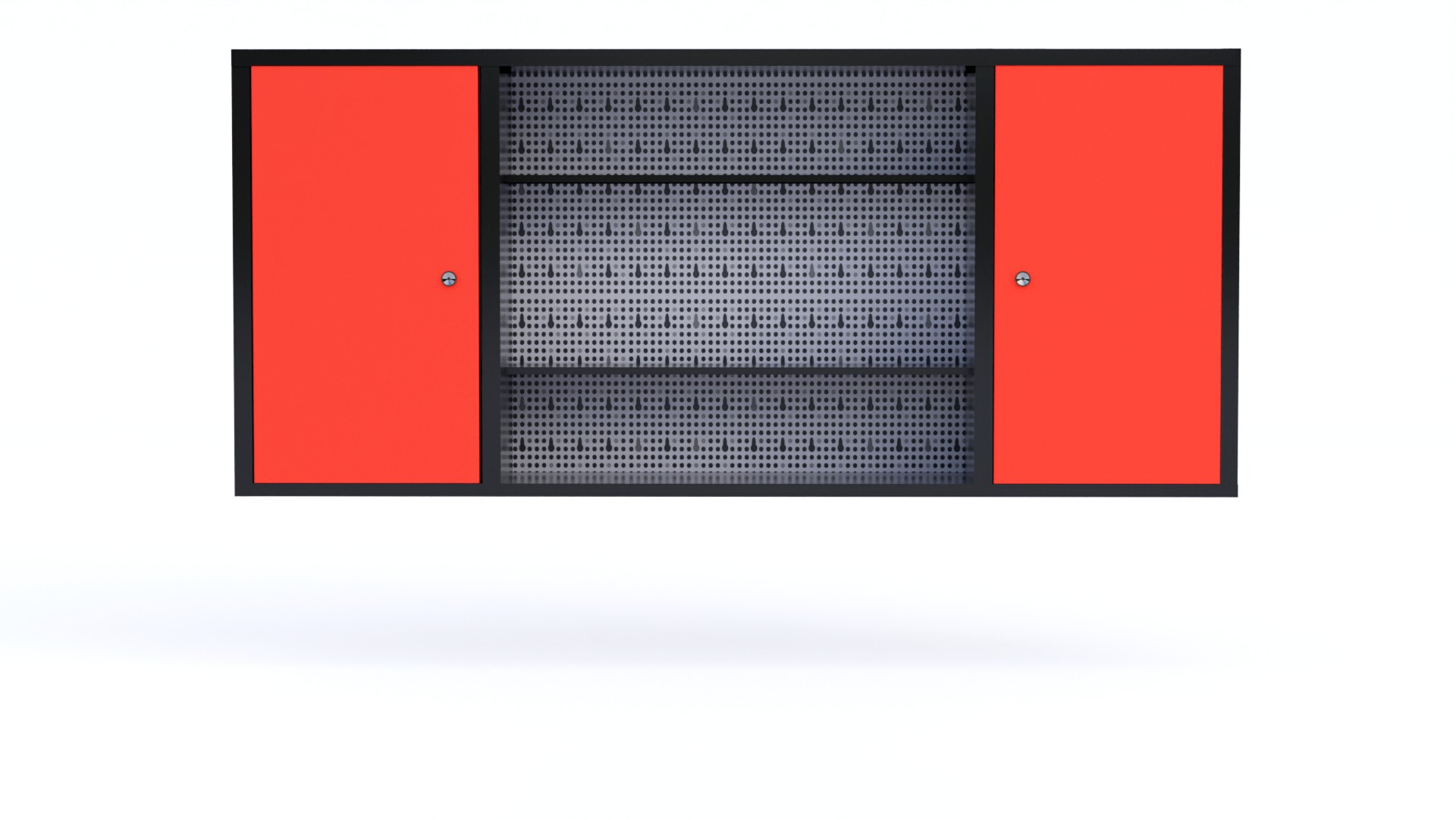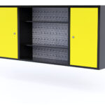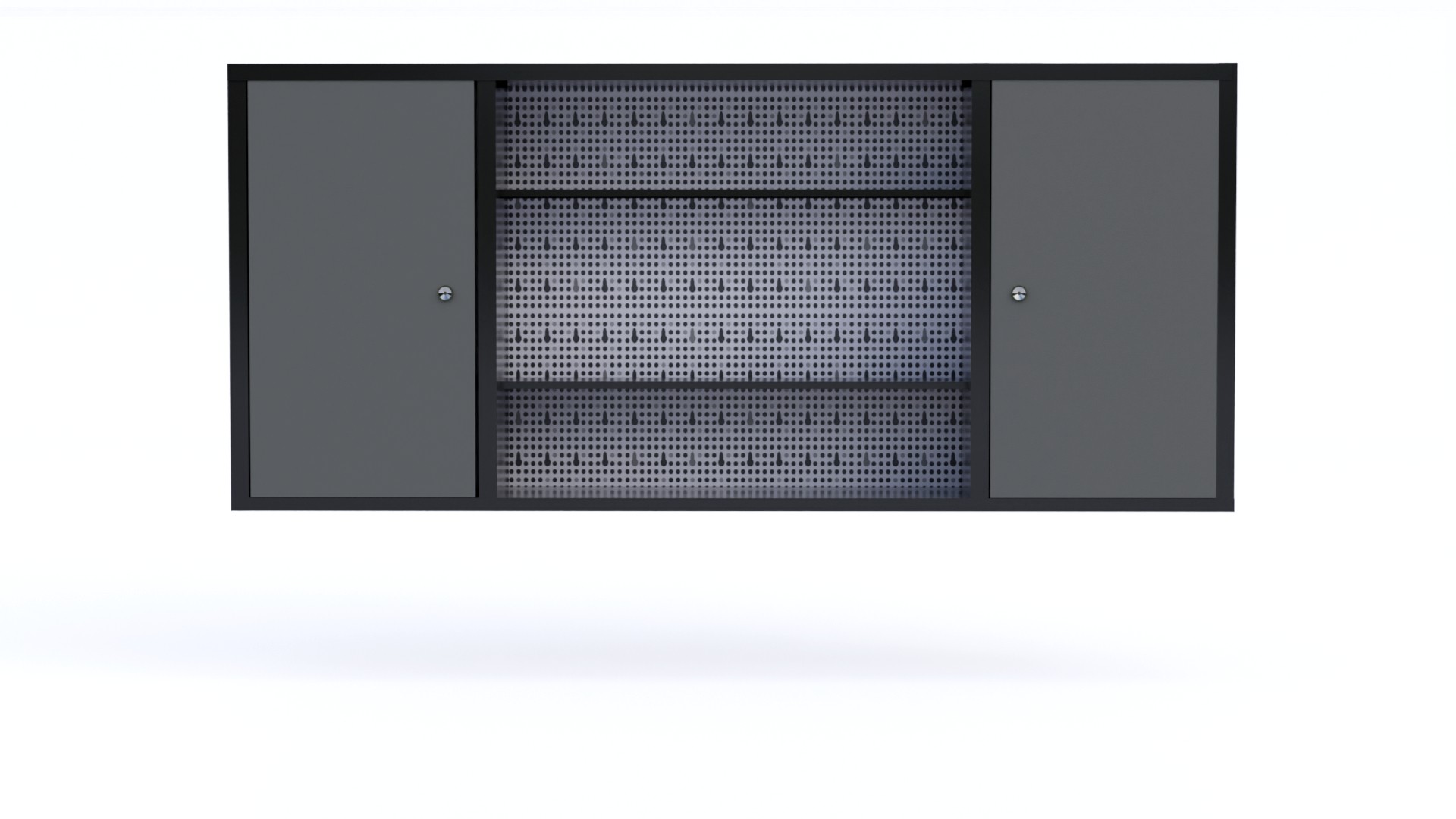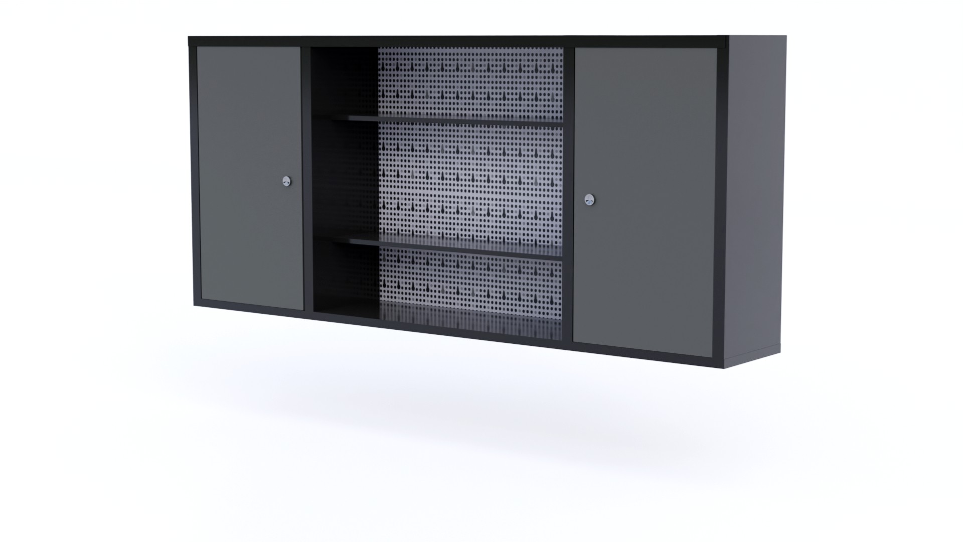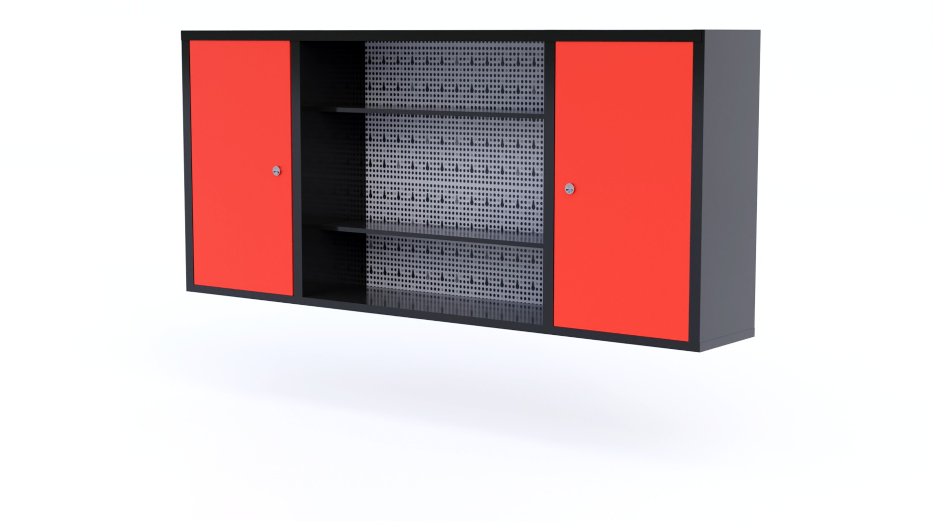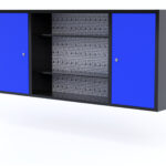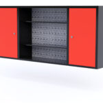 Hanging cabinet with perforated board for tools.