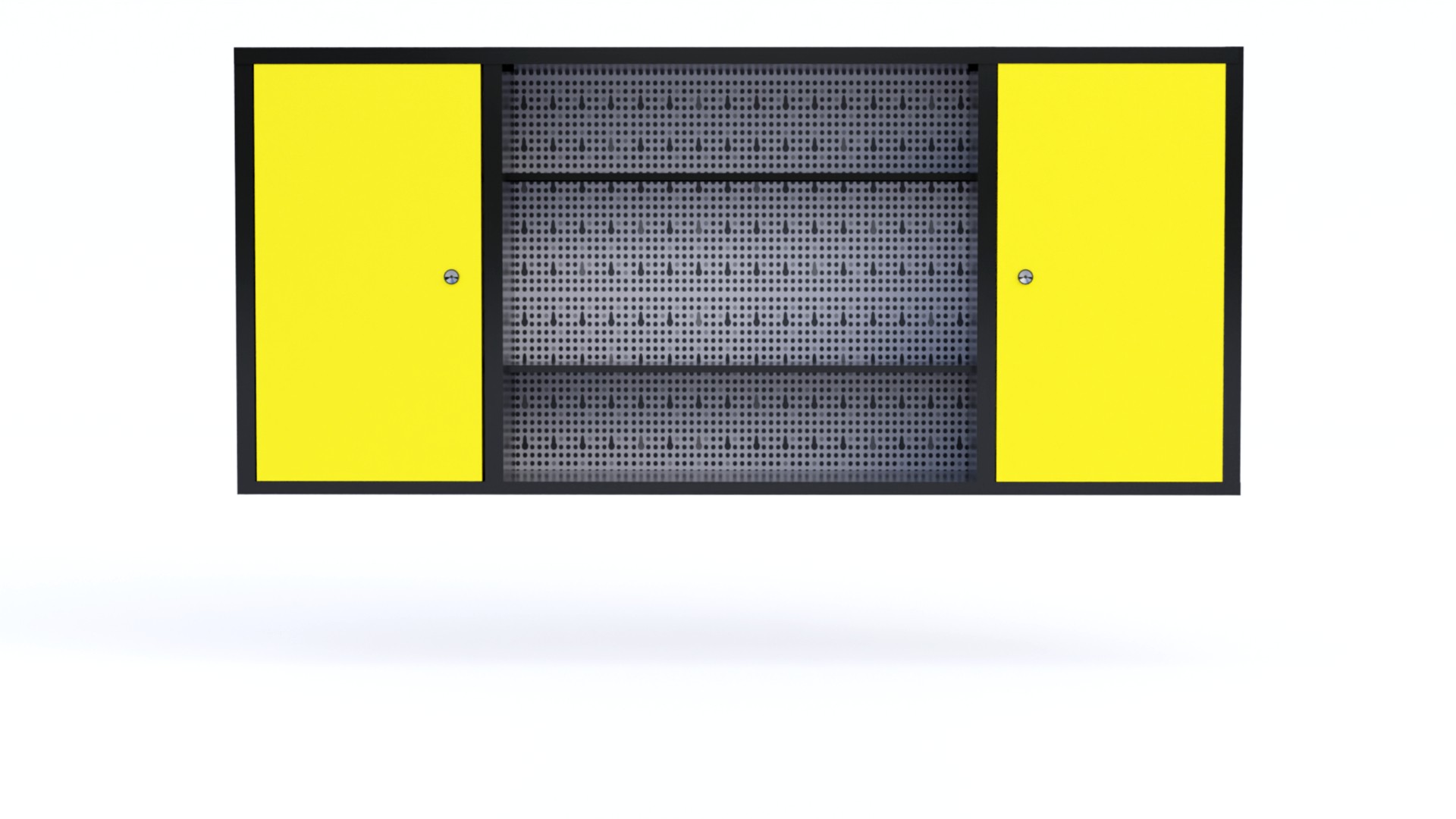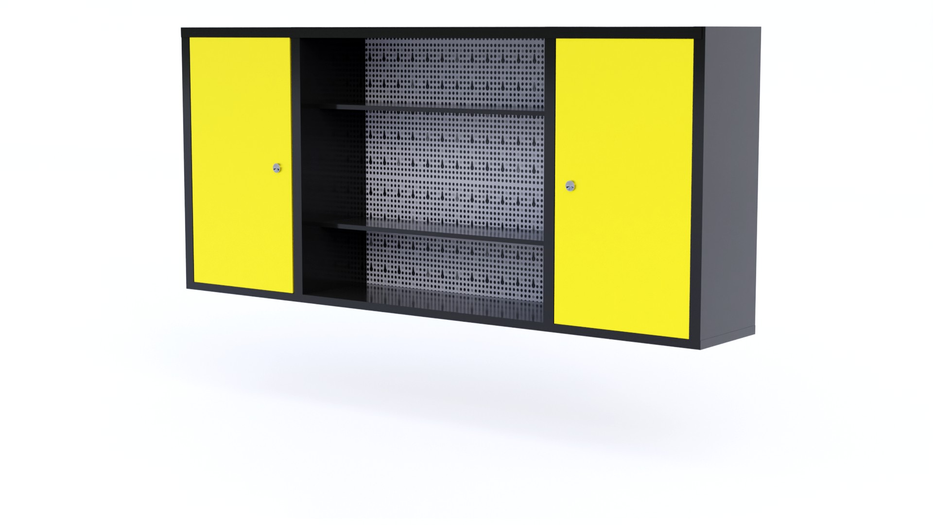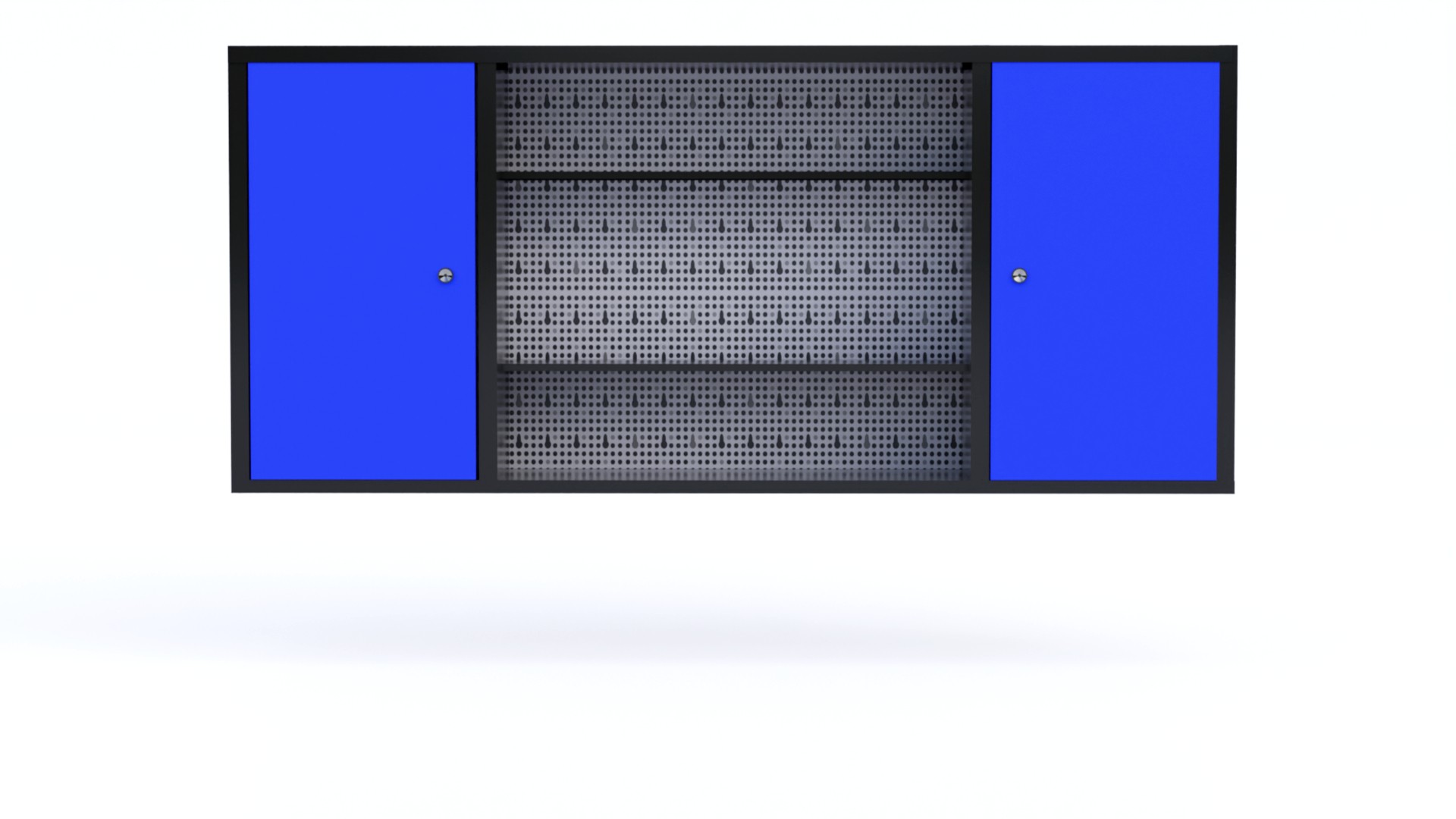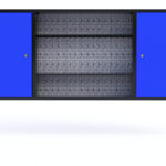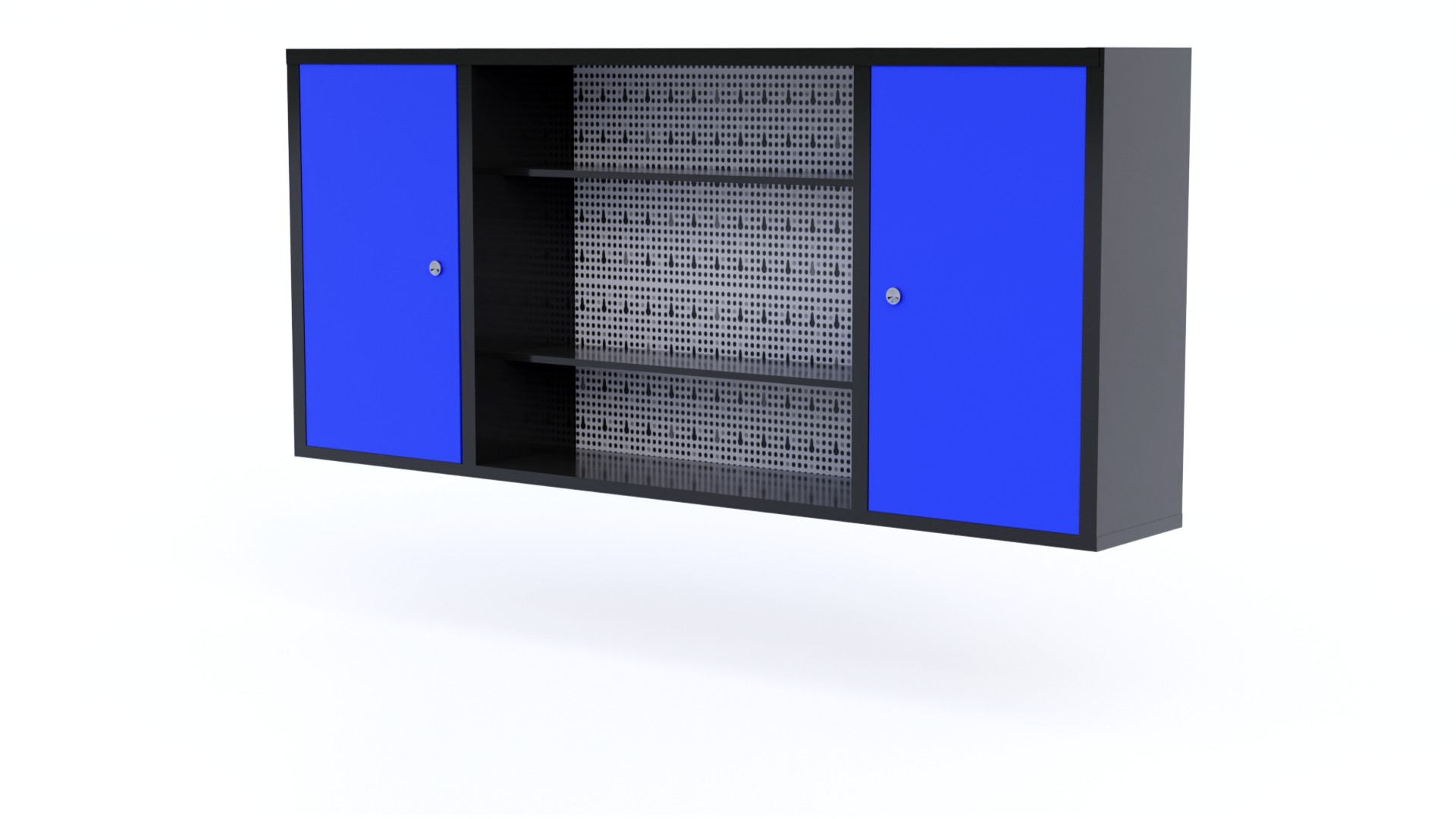 Hanging cabinet with perforated board for tools.